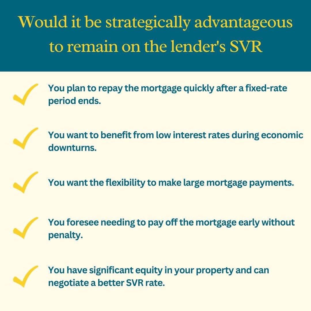 Before opting to stay on an SVR, it is crucial to consider your financial situation, risk tolerance and plans. Assess whether the flexibility of an SVR outweighs the potential for rising costs and if the SVR is competitive compared to other products, such as a tracker. Understanding the lender's policies regarding SVR rate changes and the factors that influence their decisions can also be helpful. There are several factors to be considered: